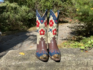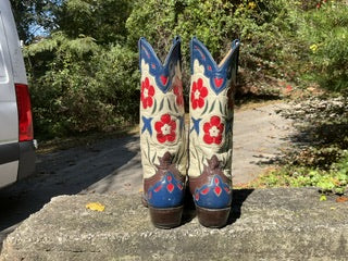 Size 7.5 women’s handmade boots. Excellent vintage condition. The famous bluebird pattern first designed by Gene Autry.