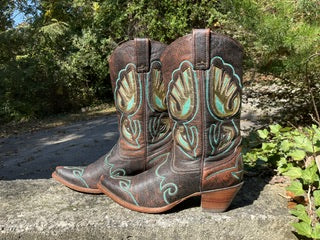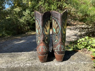 Size 8.5 women’s Corral boots. Early Corral. Very good vintage condition. Dark brown with gold leaf and turquoise inlay. Lemonwood pegs.