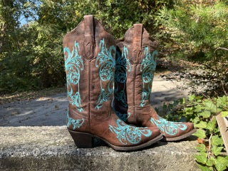 Size 8.5 women’s Corral boots. Excellent vintage condition. Brown with turquoise embroidery.