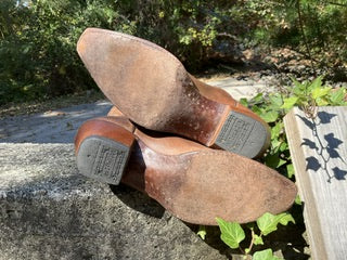 Size 8.5 women’s Corral boots. Early Corral lemonwood pegs. Medium brown with stitched shaft.