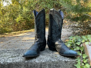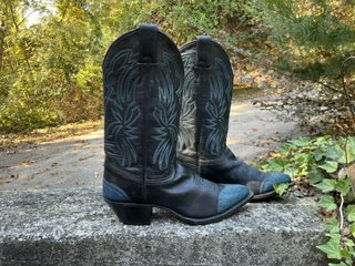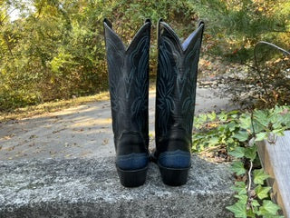 Size 8.5 women’s Justin boots. Excellent vintage condition. Black with blue toe and blue stitching.