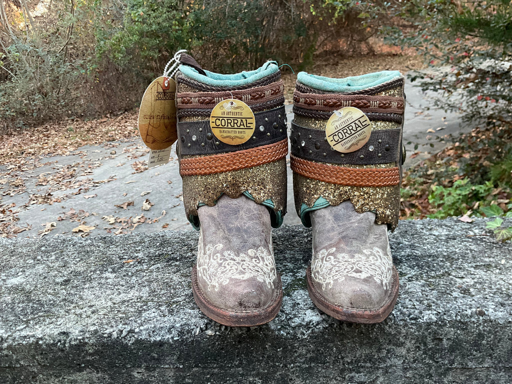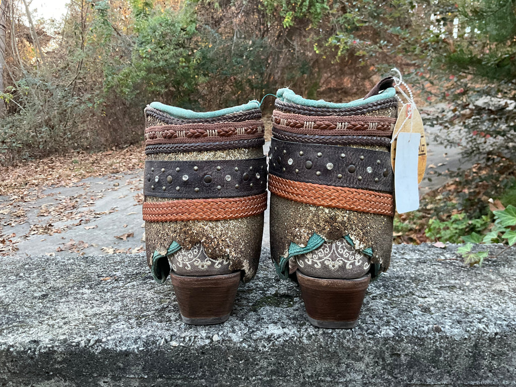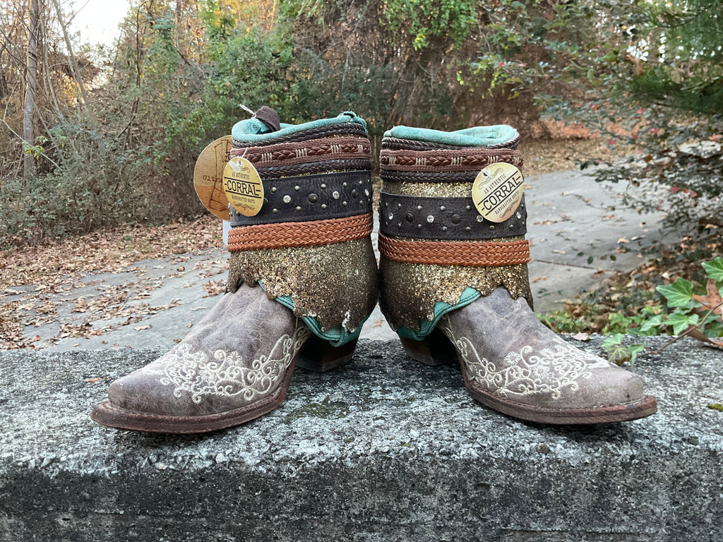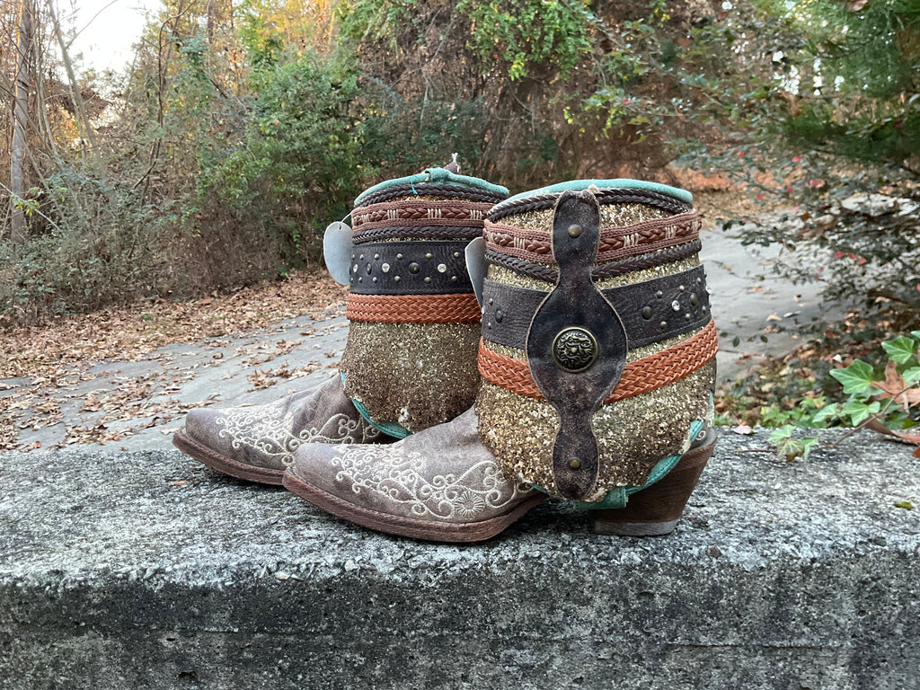 Size 8 women’s Corral boots. These are new boots upcycled by Corral. Taupe foot with layers of other material.