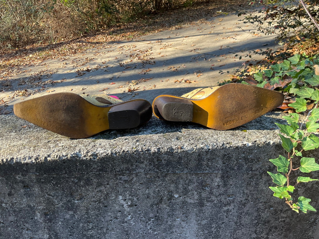 Size 8 women’s Donald Pliner mules. Excellent vintage condition. Ivory and brown with mother of pearl inlay on heels.