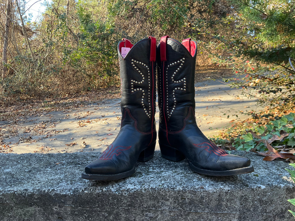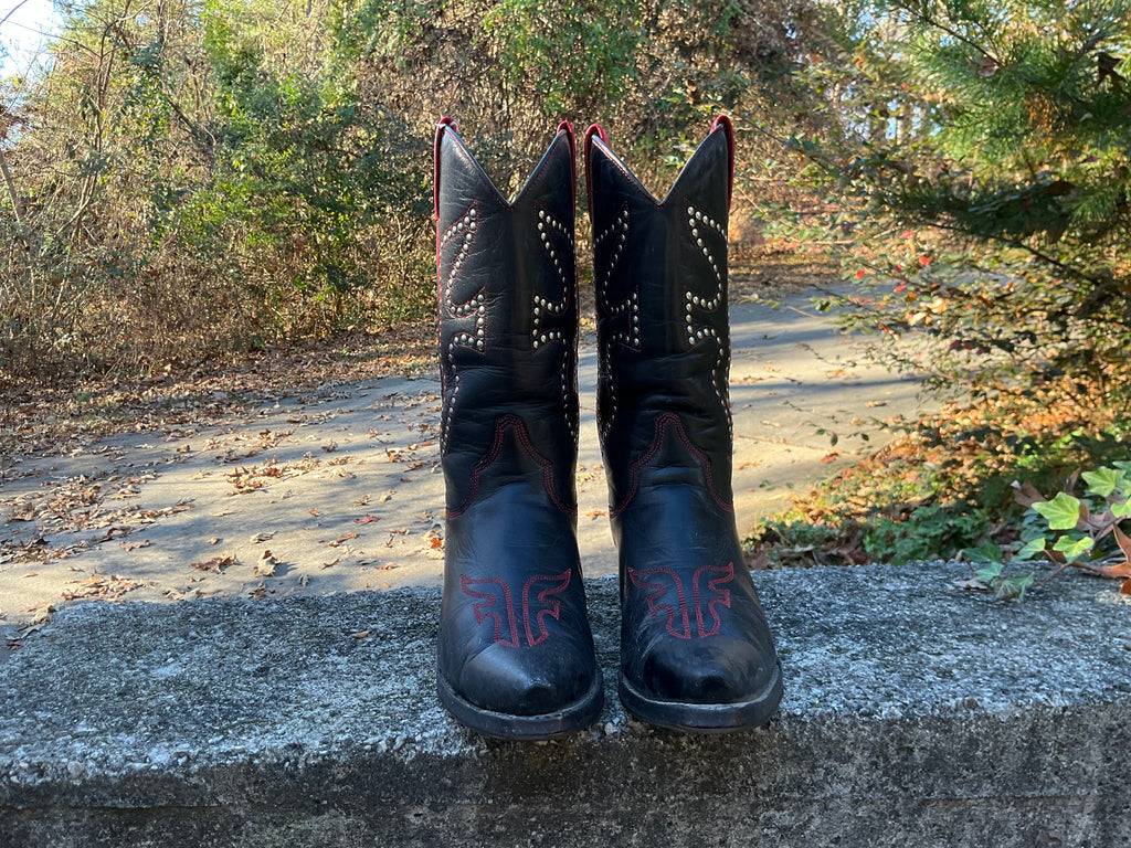 Size 8 women’s Frye boots. Excellent vintage condition. Daisy Duke style. Black with red trim and studs.