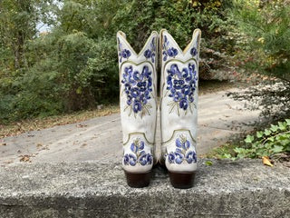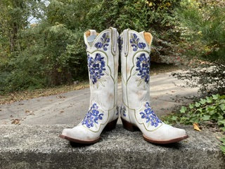 Size 8 women’s Old Gringo boots. Distressed white with bluebell flowers. Used for a photo shoot.