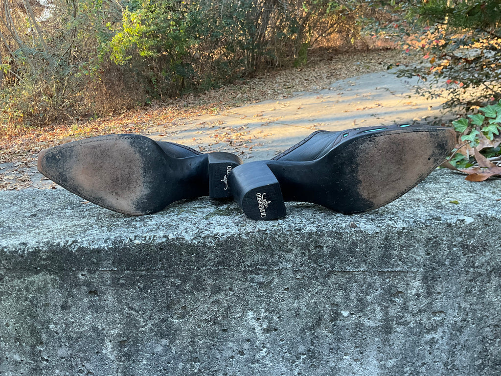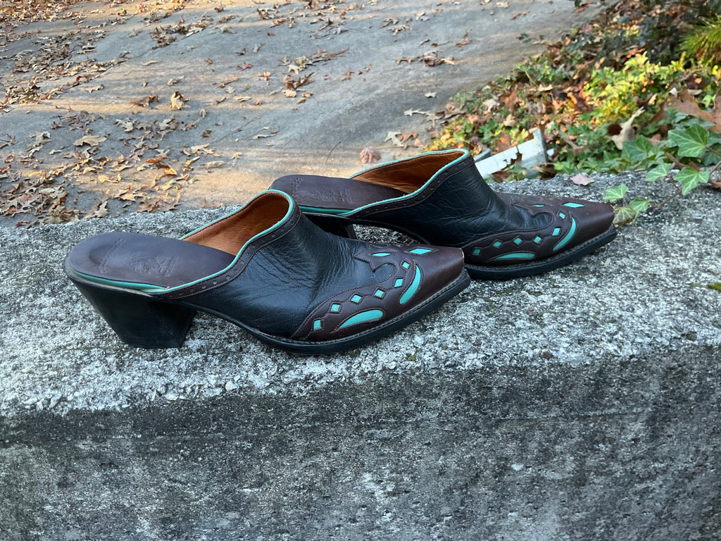 Size 8 women’s Old Gringo mules. Excellent vintage condition. Black and brown with turquoise inlay.