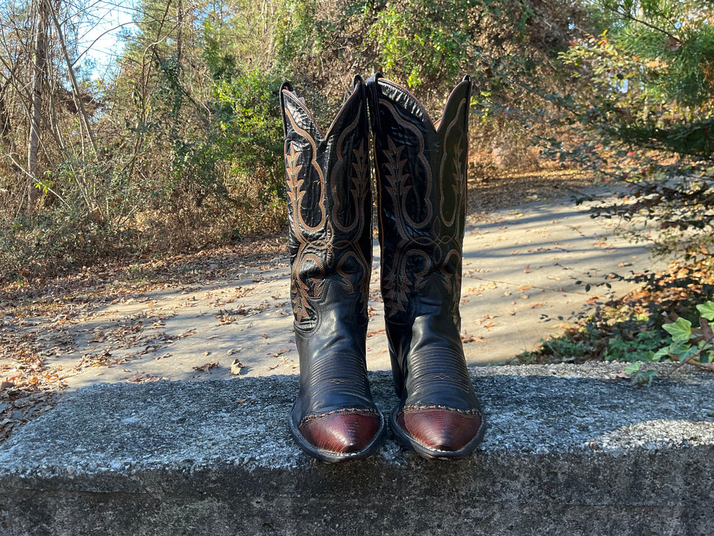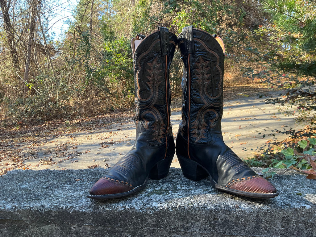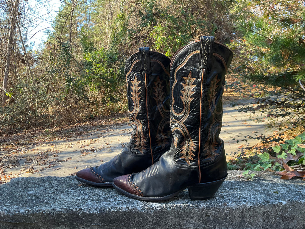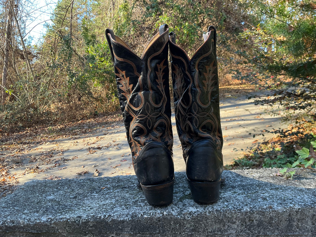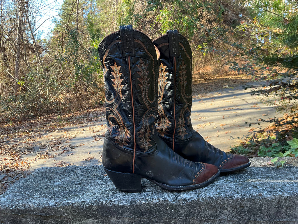 Size 8 women’s Tony Lama boots. Black with brown toes and stitching. Very good vintage condition.
