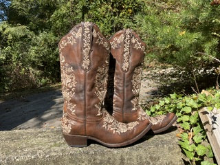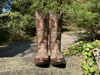 Size 9.5 women’s Black Star boots. Excellent vintage condition. Brown with ivory stitching and crystals.
