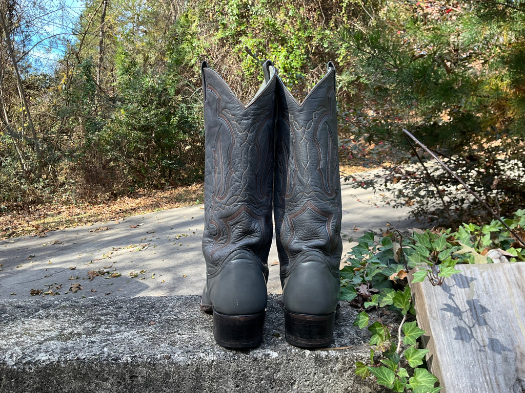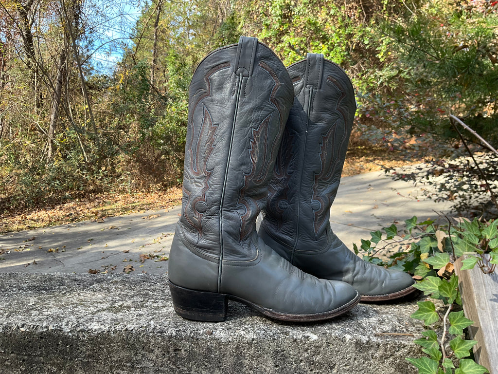 Size 9 men’s or 10.5 women’s Larry Mahan boots. Very good vintage condition. All gray.