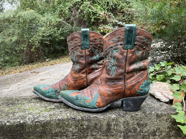 Size 10 women’s Corral boots. Very good vintage condition. Dark brown with turquoise trim.