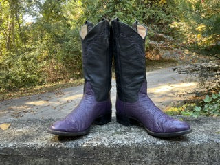 Size 7 men’s or 8.5 women’s Larry Mahan boots never worn. Excellent vintage condition. Purple ostrich foot with black shaft.