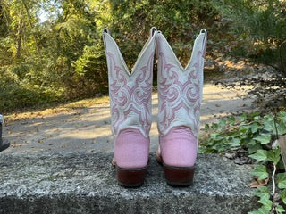 Size 7 women’s Justin boots. Excellent vintage condition. Distressed pink foot with white shaft with pink stitching.