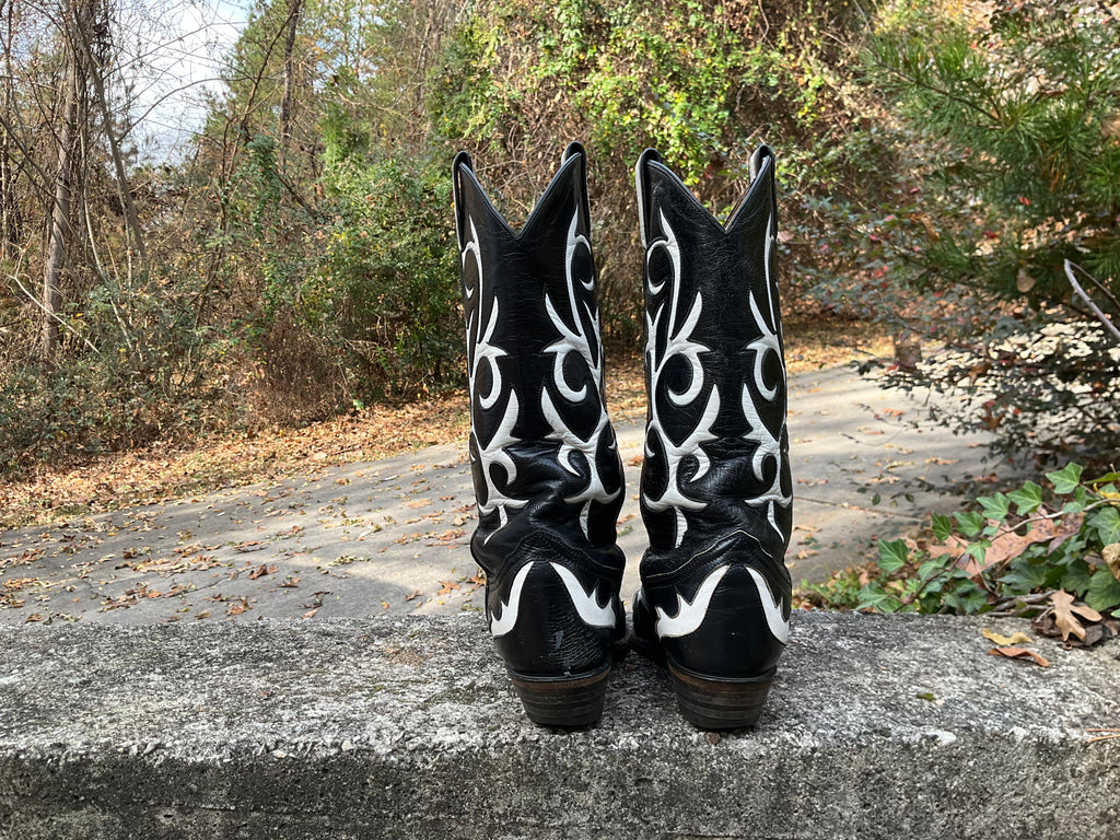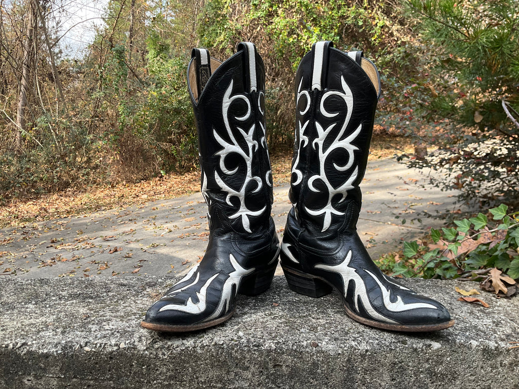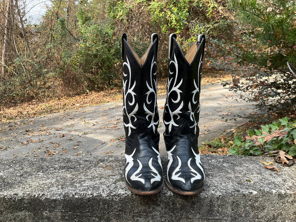 Size 7 women’s Larry Mahan boots. Very good vintage condition. Black with white inlay.