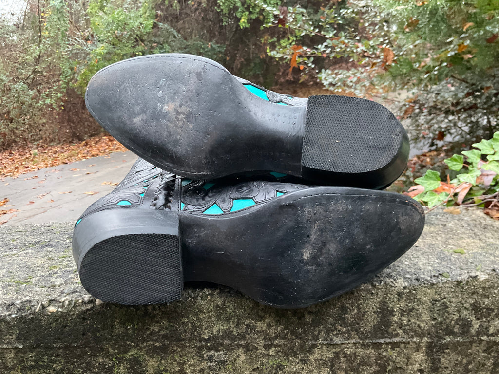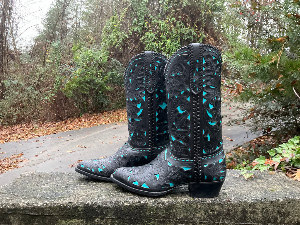 Size 9.5 men’s or 11 women’s Longhorn boots. These are new handmade boots. Excellent quality. Turquoise with black tooling.