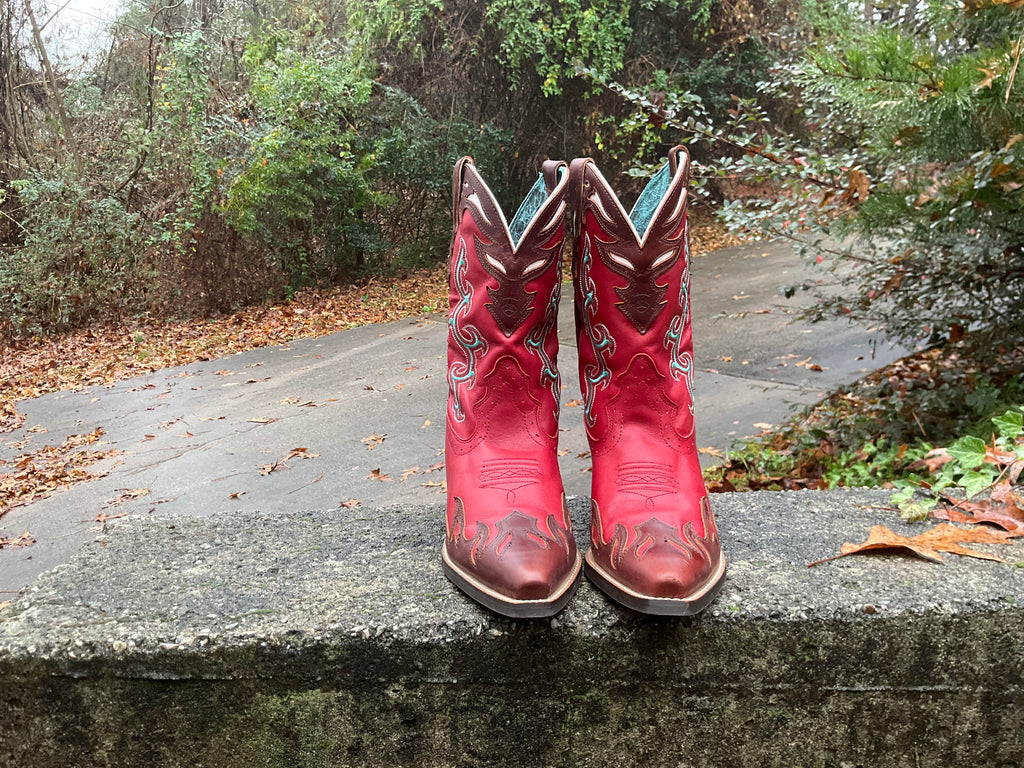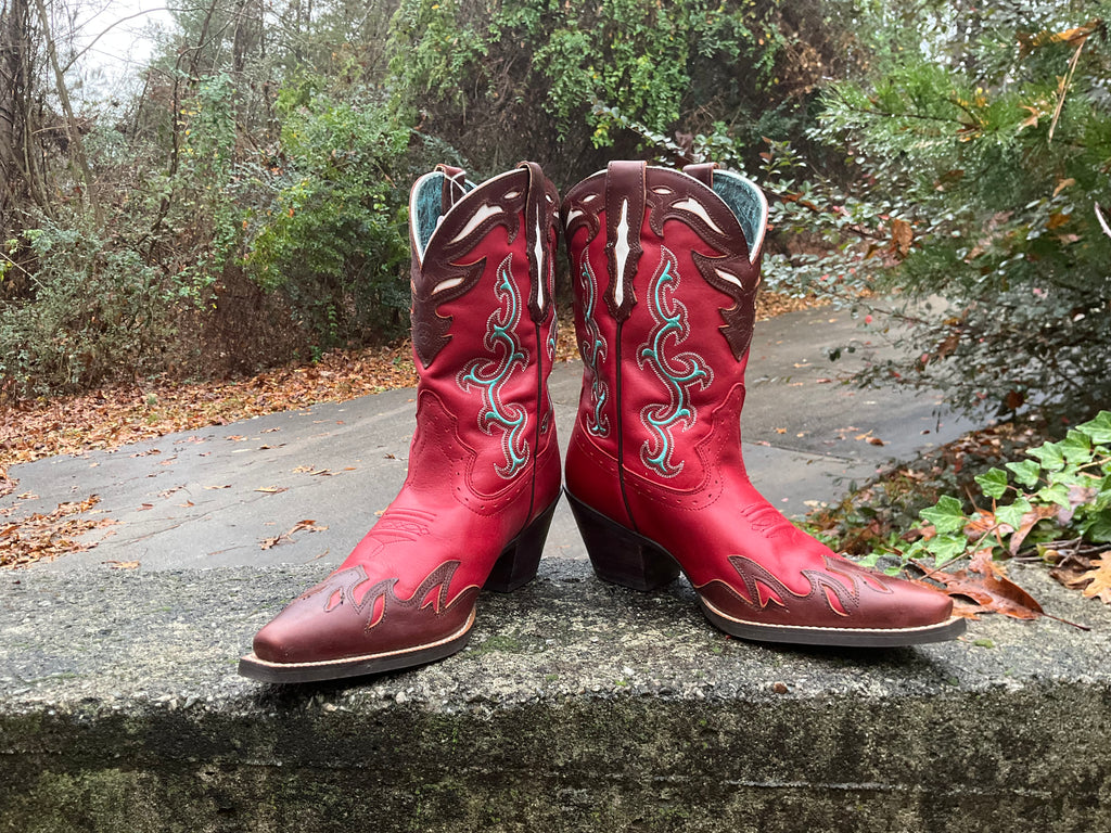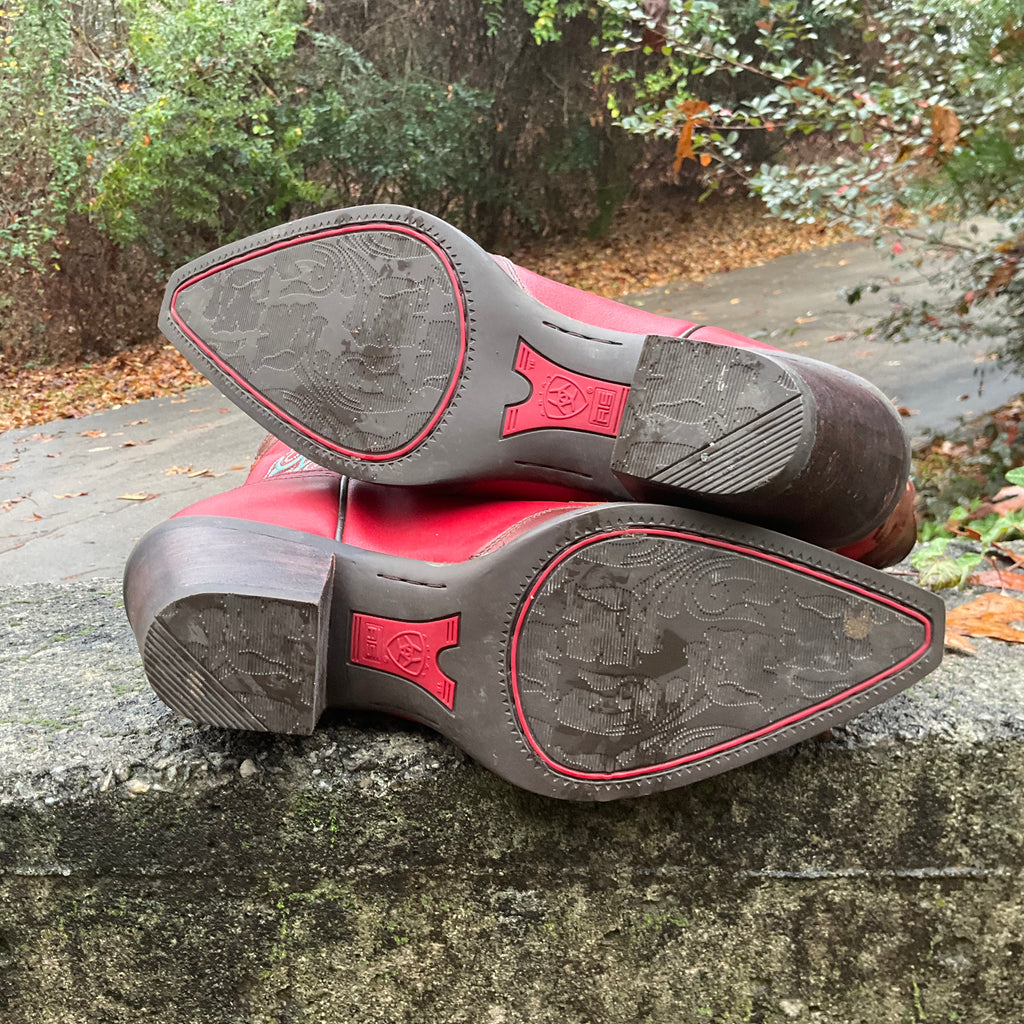 Size 9.5 women’s Ariat boots. Excellent vintage condition. Red, brown and white with turquoise inlay.