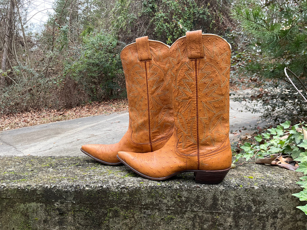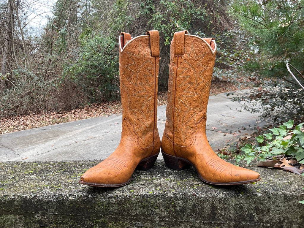 Size 9.5 women’s Nocona boots. Tan smooth ostrich. Excellent vintage condition.
